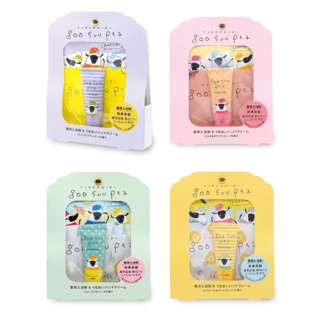 おやすみ前の保湿ケアに4種の香りから選べる薬用入浴剤とミニハンドクリームのセット。