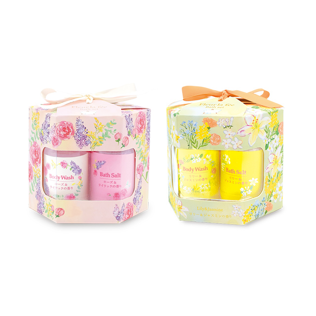 バスソルト、ボディウォッシュ、スポンジを詰め合わせたバスセット。